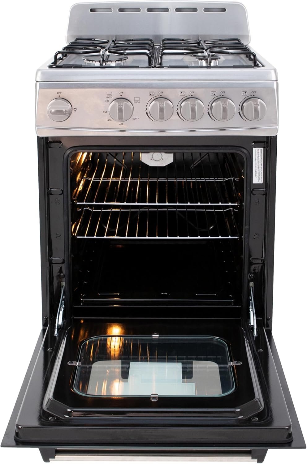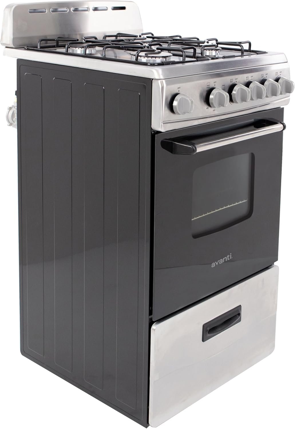 The Avanti 20-Inch Gas Range Oven is the ultimate space-saving solution for small kitchens, studio apartments, RVs, and vacation homes. Designed with efficiency and style in mind, this compact freestanding gas range features 4 sealed burners (1 rapid, 2 semi-rapid, and 1 simmer) with electronic ignition for precise and consistent cooking. The 2.1 cu. ft. oven offers ample space with two racks and includes a broiler with a broiling pan, making it perfect for baking, roasting, and broiling. Additional features such as a seamless framed glass oven door, 60-minute timer, oven light, and a storage drawer ensure convenience and functionality. With an LP conversion kit, ADA-compliant design, and integrated backsplash with oven vents, this gas range is versatile, practical, and perfect for any small kitchen setup.