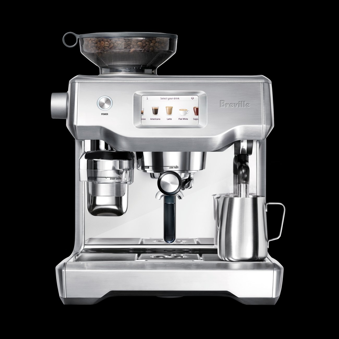 Select your drink on the touch screen and adjust strength, milk texture, and temperature if you wish.