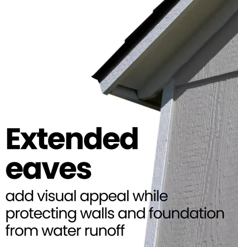 Extended eaves help protect the shed walls and foundation by directing rainwater away efficiently.