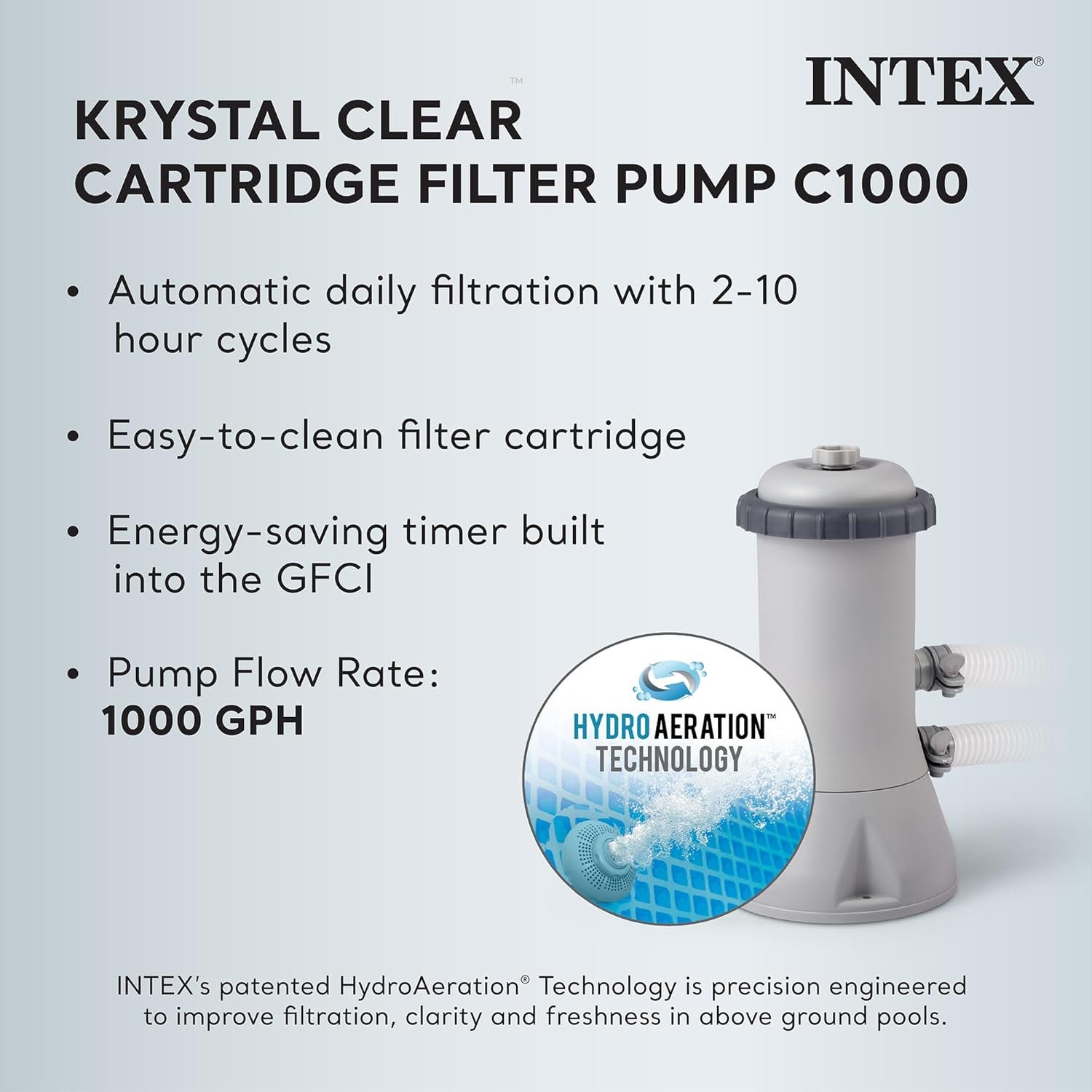 Krystal Clear Filtration – The included pump filters 1000 GPH and incorporates HydroAeration Technology into the cartridge filter pump providing improved circulation and filtration, improved water clarity, and increased negative ions