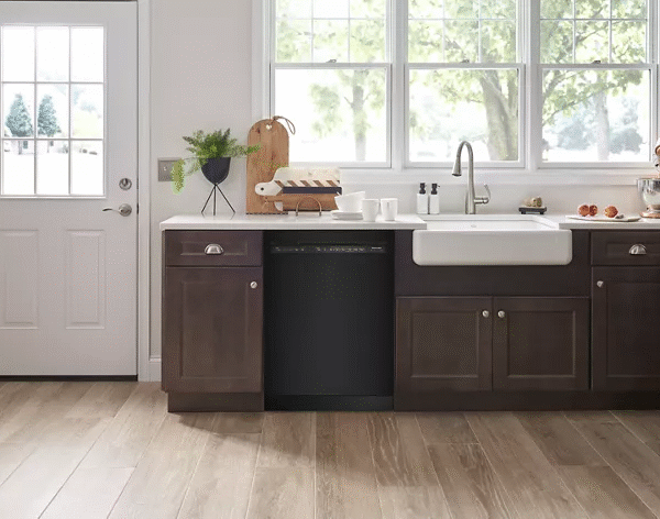 Top controls are tucked away on top of the dishwasher door for a clean look to match your kitchen style, an indicator light on the front of the door changes colors to subtly display cycle progress