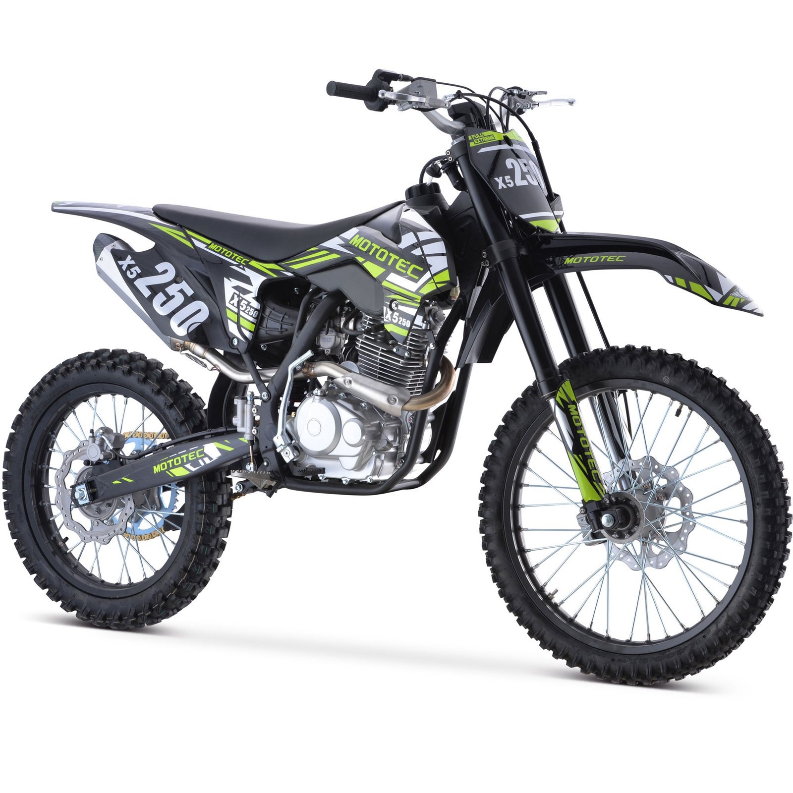 The MotoTec X5 250cc 4-Stroke Dirt Bike – The latest generation of 250cc mini bike engines are faster, torquier, more reliable and even easier to set up and start than ever before. Electric start, improved carburetor and all of the standard safety features, support and reliability that MotoTec provides.