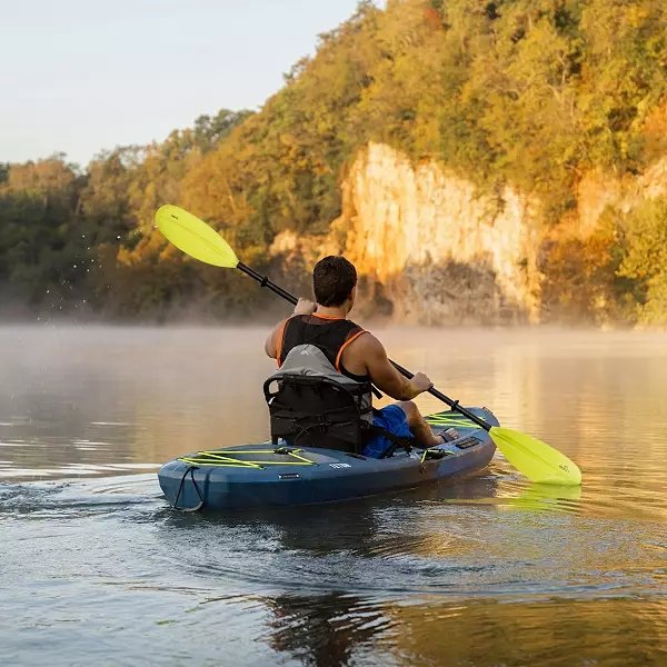 This kayak has several features that ensure an elevated, comfortable, and convenient user experience. The mesh, frame seat can be easily adjusted and removed while offering optimal comfort. The graduated footwells allow the paddler to choose the best foot positioning while paddling. Gear can be stored in the adjustable bow and stern bungees. The low-profile center and side rails enable the user to attach various accessories. Personal items can be kept secure in the dry storage hatch, which includes a molded-in water bottle groove. In addition, the kayak has dual paddle keepers and two built-in fishing rod holders. The rear well has enough space to accommodate a 5-gallon bucket for easy storage. The kayak is equipped with a removable drain plug and six self-bailing scupper holes. The multi-chine hull design provides excellent stability while navigating through waters. For easy transport, the kayak has convenient carry handles and luggage-style handles that allow for transport by one or more people