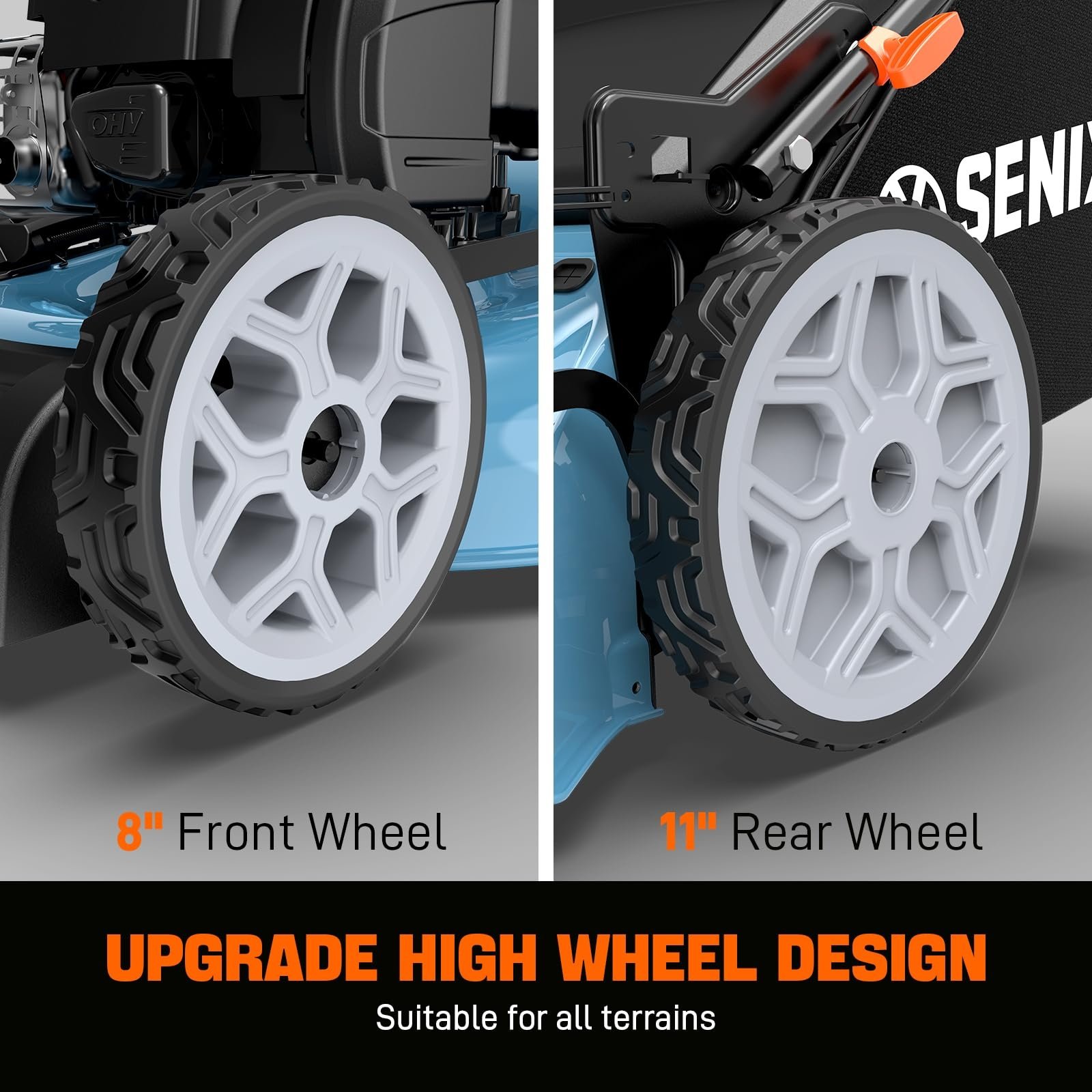 EASY HEIGHT ADJUSTMENT: The 6-position singel-lever height adjustment from 1.25-inch to 4-inch ensures you get the perfect cut every time; Durable 8-inch front and 11-inch rear wheels provide great maneuverability through tough terrain