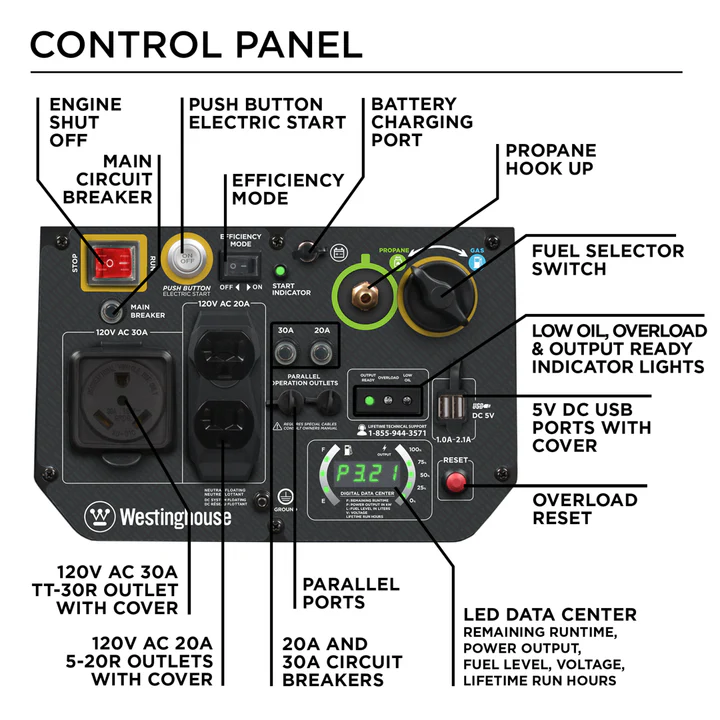 The Westinghouse iGen4500DF Dual Fuel Inverter Generator is a premium power solution to meet your portable power needs whether you’re camping or on the go. With a TT-30R RV Ready Outlet, two 20A household outlets, and built-in USB ports, this generator is ideal for recreational activities or as an emergency backup source. It’s engineered for maximum fuel efficiency with variable engine speed to produce only the power you need at any given time, running up to 18 hours on a 3.4-gallon gas tank. As a dual fuel generator, the iGen4500DF operates on gasoline or propane for versatility wherever you are. Conveniently built with Push-Button Electric Start and wireless remote start for easy ignition and has an LED Data Center with an automatic rotating digital display to keep you up to date with real-time information. At less than 3% THD, the iGen4500DF is perfect for running sensitive electronics like LCD/plasma televisions, laptops, tablets, or mobile devices that require clean, stable power. It features a lightweight, compact design with wheels and an extendable suitcase-style handle, making this model effortlessly more portable than traditional generators. The iGen4500DF is ensured by a 3-year limited warranty from a nationwide service network and lifetime technical support.